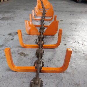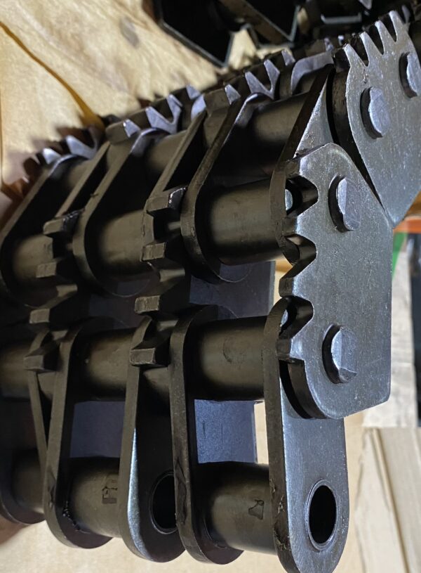 Una cadena dentada “Sharp‑Top” es un tipo especializado de cadena con dientes/placas afiladas diseñada para transmitir grip o agarre en sistemas de transporte de materiales, especialmente en industrias forestales y aserraderos
